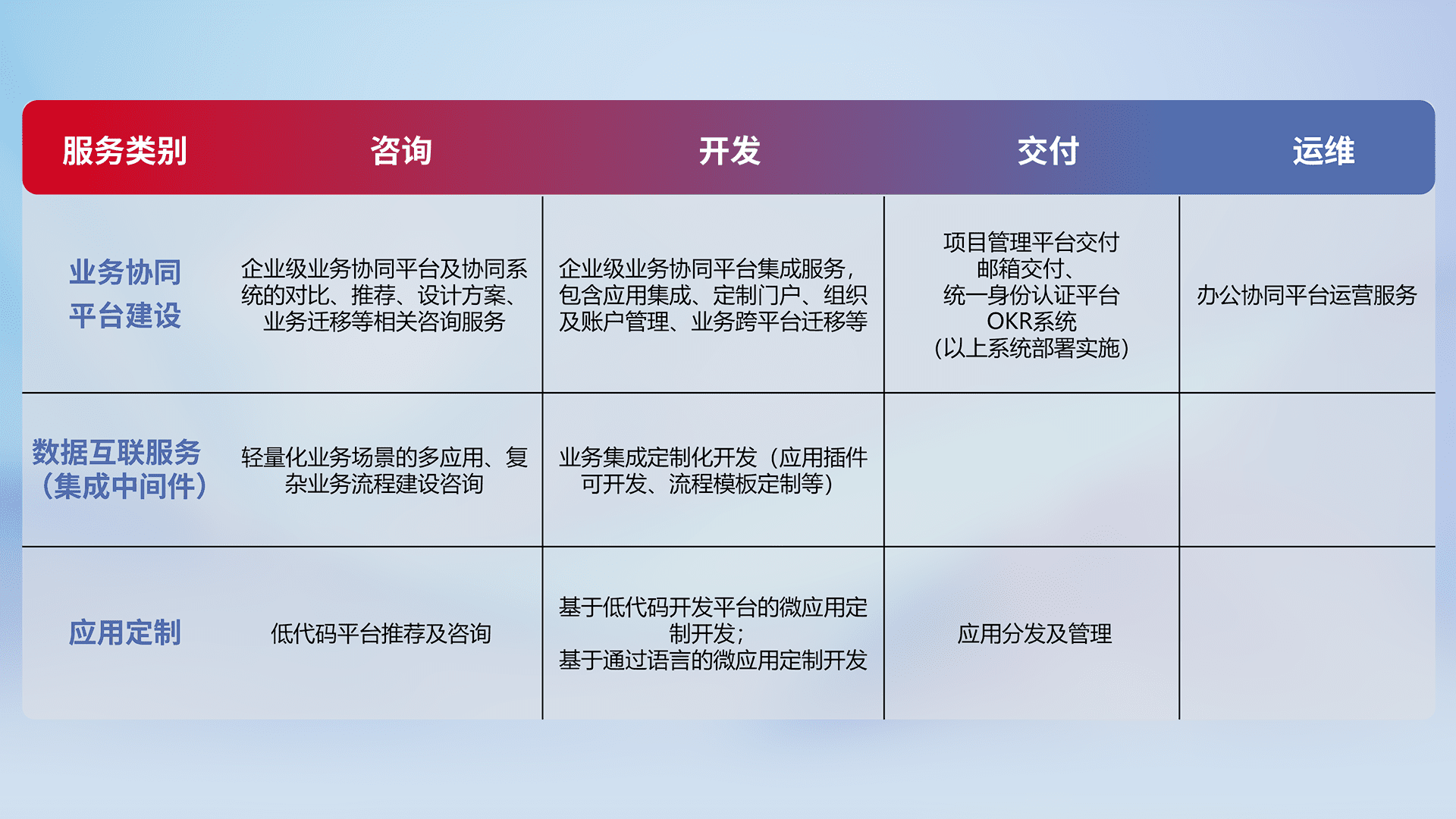 针对钉钉、、、、企微、、、、IDaas等平台级产品提供产品的规划、、方案、、交付、、定制化开发等服务,,实现如统一协同办公、、智能客户服务、、混合会议管理、、、智能数据查询、、等业务场景,,,,实现数字化转型。。。。